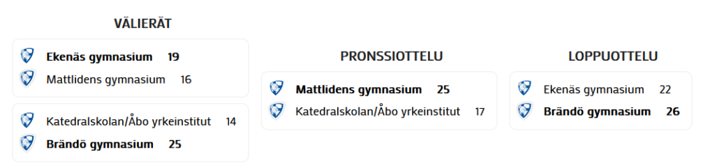 Brändö gymnasium (Helsinki) on poikien toisen asteen mestari koulukäsipallossa. Brändö voitti finaalissa kotijoukkue Ekenäs gymnasiumin maalein 26-22. Pronssit matkaavat Espooseen, kun Mattliden voitti pronssiottelussa Katedralskolan/Åbo yrkeinstitutetin 25-17.